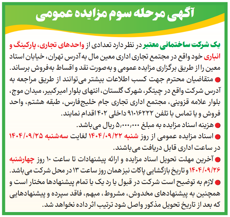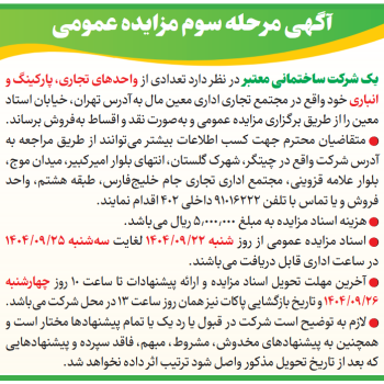 به گزارش روابط عمومی شرکت ساختمانی بانک ملت، این شرکت با درج آگهی مزایده عمومی […]