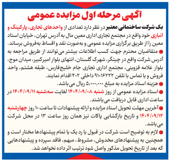 به گزارش روابط عمومی شرکت ساختمانی بانک ملت، این شرکت با درج  آگهی مرحله اول مزایده عمومی در روزنامه اطلاعات مورخ 6 آذر ماه 1404، در نظر دارد تعدادی از واحدهای تجاری، پارکینگ و انباری خود واقع در مجتمع تجاری اداری معین مال به آدرس تهران، خیابان استاد معین را به صورت نقد و اقساط به فروش برساند.