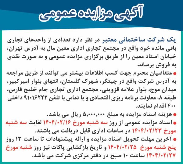 به گزارش روابط عمومی شرکت ساختمانی بانک ملت، این شرکت با درج آگهی مزایده عمومی در روزنامه اطلاعات مورخ 15 اردیبهشت ماه 1404، در نظر دارد ملکیت تعداد محدودی از واحدهای تجاری باقی مانده خود را واقع در طبقات 1- ، همکف و 1+ مجتمع تجاری _ اداری معین مال به آدرس تهران، خیابان استاد معین در قالب برگزاری مزایده به صورت نقدی به فروش برساند.