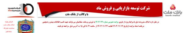 براساس این گزارش، املاک مازاد بانک ملت از طریق شرکت توسعه بازاریابی و فروش ماد با وکالت این بانک، از طریق مزایده عمومی و با شرایط ویژه به فروش خواهد رسید.