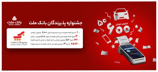 یک جایزه کمک هزینه خرید خودرو به ارزش 600 میلیون تومان، سه کمک هزینه خرید تلفن همراه هر کدام به ارزش 100 میلیون تومان و 46 جایزه نقدی 50 میلیون تومانی، جوایز نهایی جشنواره پذیرندگان شرکت به پرداخت ملت است که بر اساس امتیازات کسب شده به برندگان تعلق خواهد گرفت.