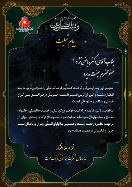 پیام تسلیت و ابراز همدردی مدیریت شرکت ساختمانی بانک ملت با نائب رئیـس هیئت مدیره
